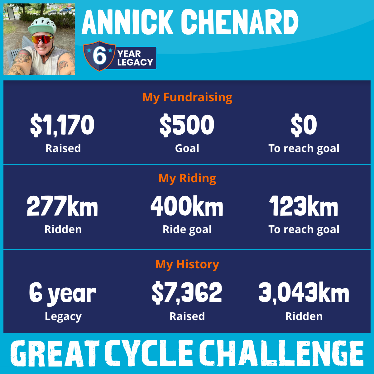 This will be the sixth year where, in August, I take part in the Great Cycle Challenge to fight kids' cancer with two goals in mind: raise a shitload of money and awareness to help fight childhood cancer AND get my arse off the couch and on the road! The challenge always yields aches, pains and sore lady parts, but it got me discovering my city, pushing myself a little further every day and contributing to a cause I really care about!