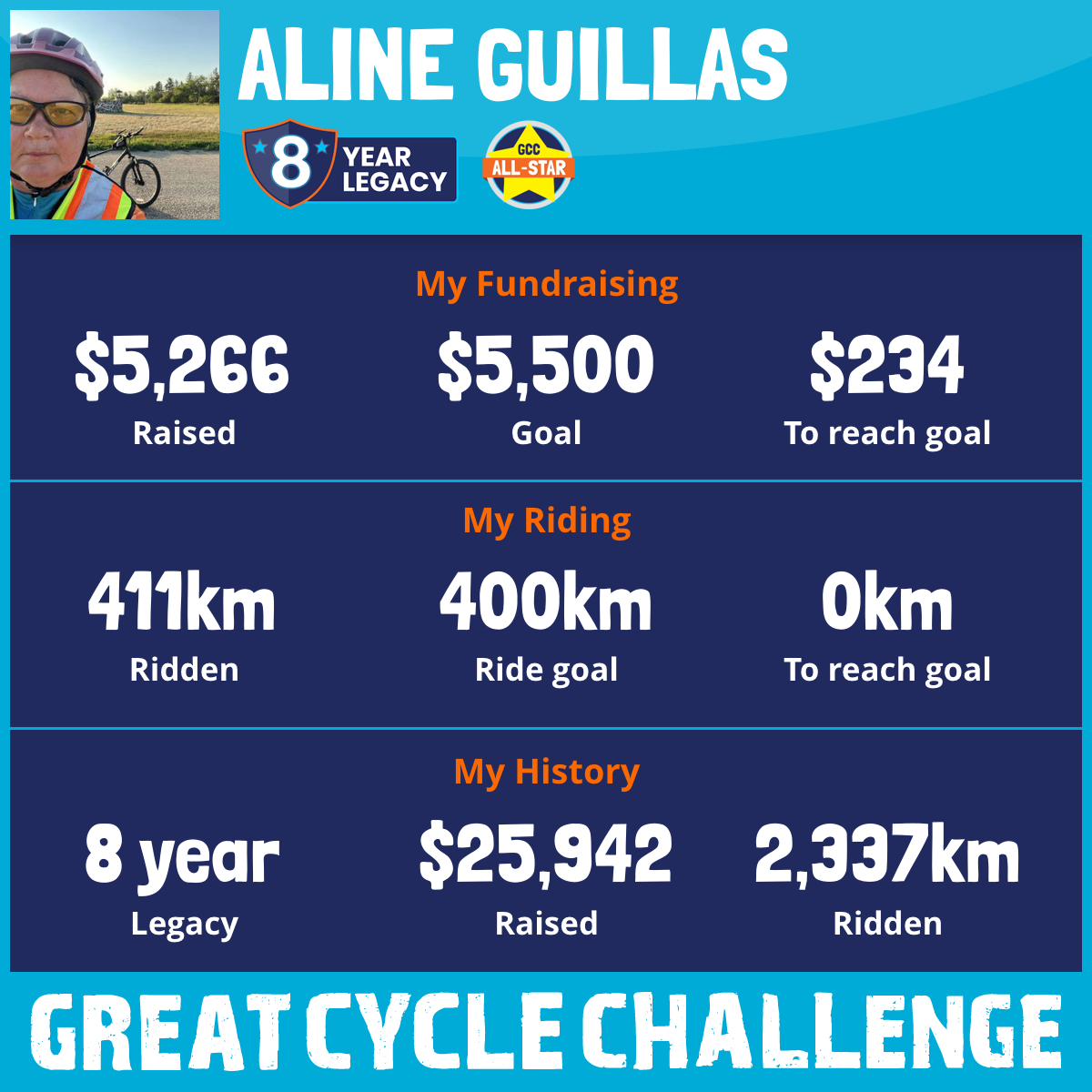 411 km Ridden$5,511 Raised2025