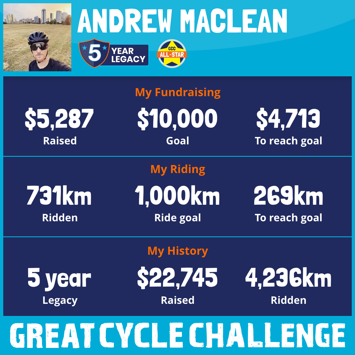This August, I am taking part in my 5th year of the Great Cycle Challenge to fight kids' cancer! Sadly, I don’t think I will be able to beat my km goal of last year, I’m dealing with a minor knee injury and will have to manage the injury/pain throughout the month. I’m going to do my best inside every day, even if it is just a few km.