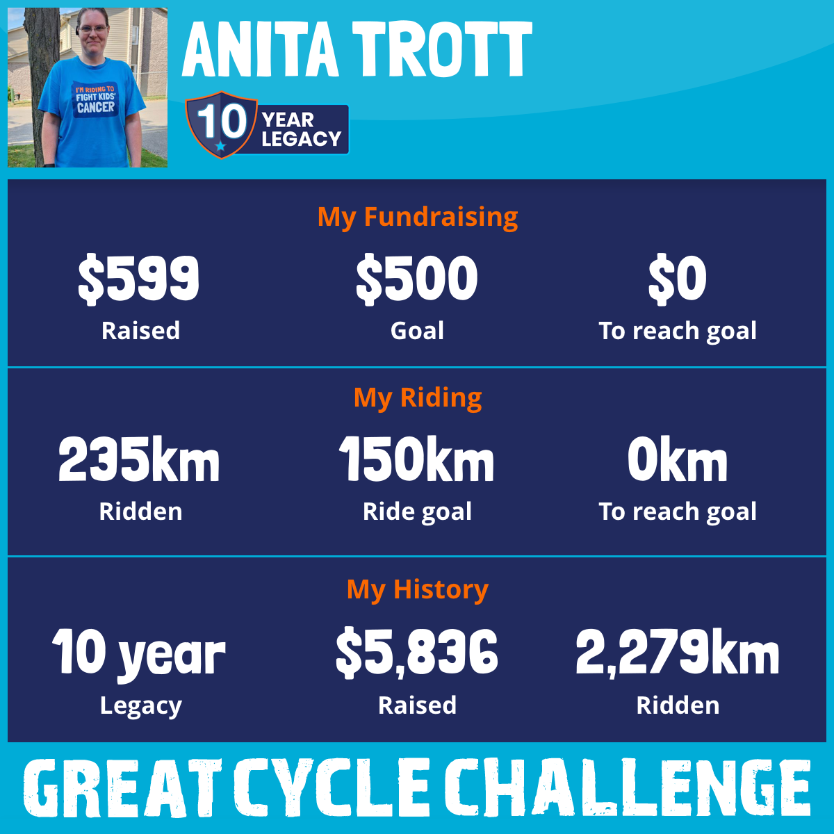 9th Year! I'm riding again this August, taking part in the Great Cycle Challenge to fight kids' cancer!
