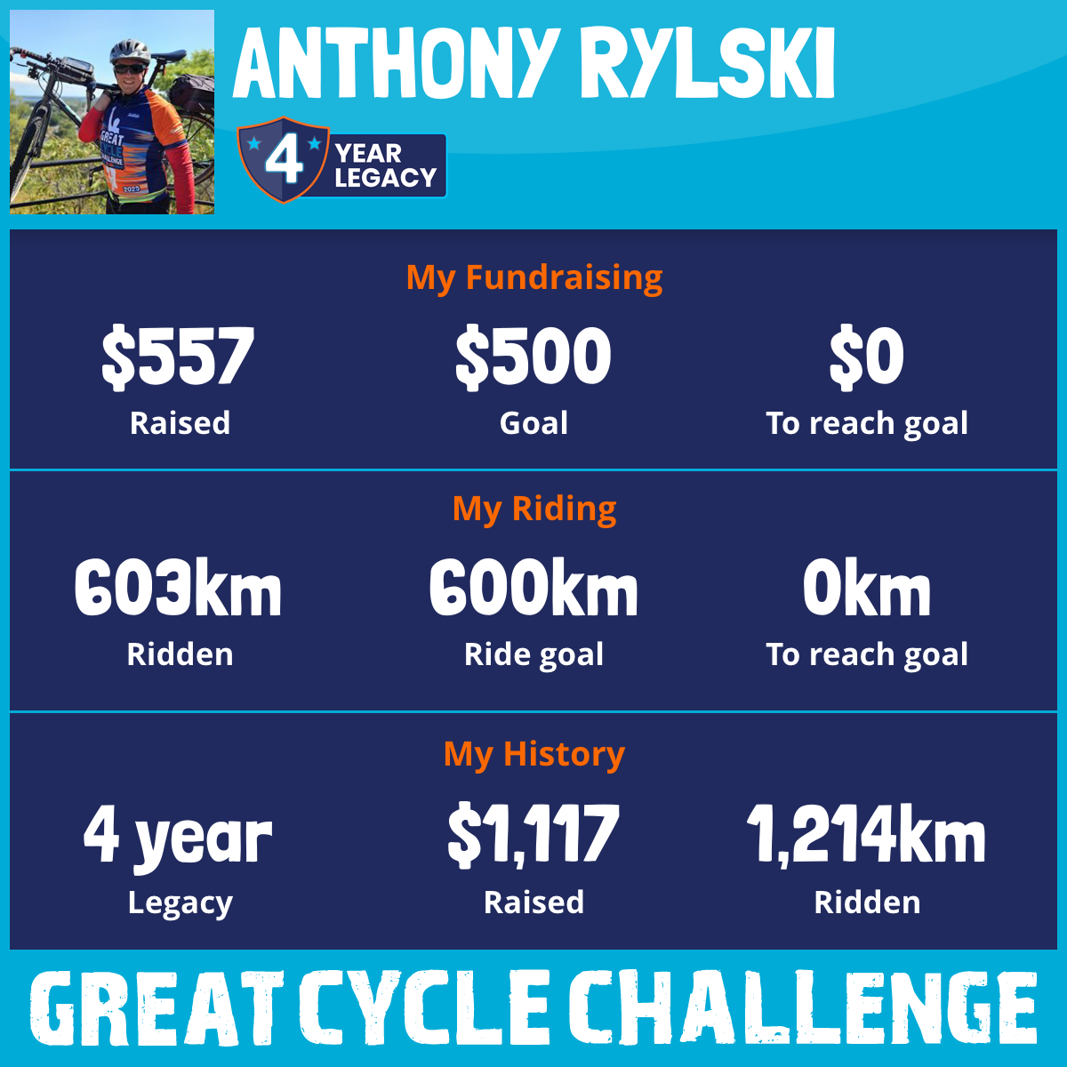 I would like to ask you to consider supporting me and my team in our goal to raise $600 and ride 850Kms.