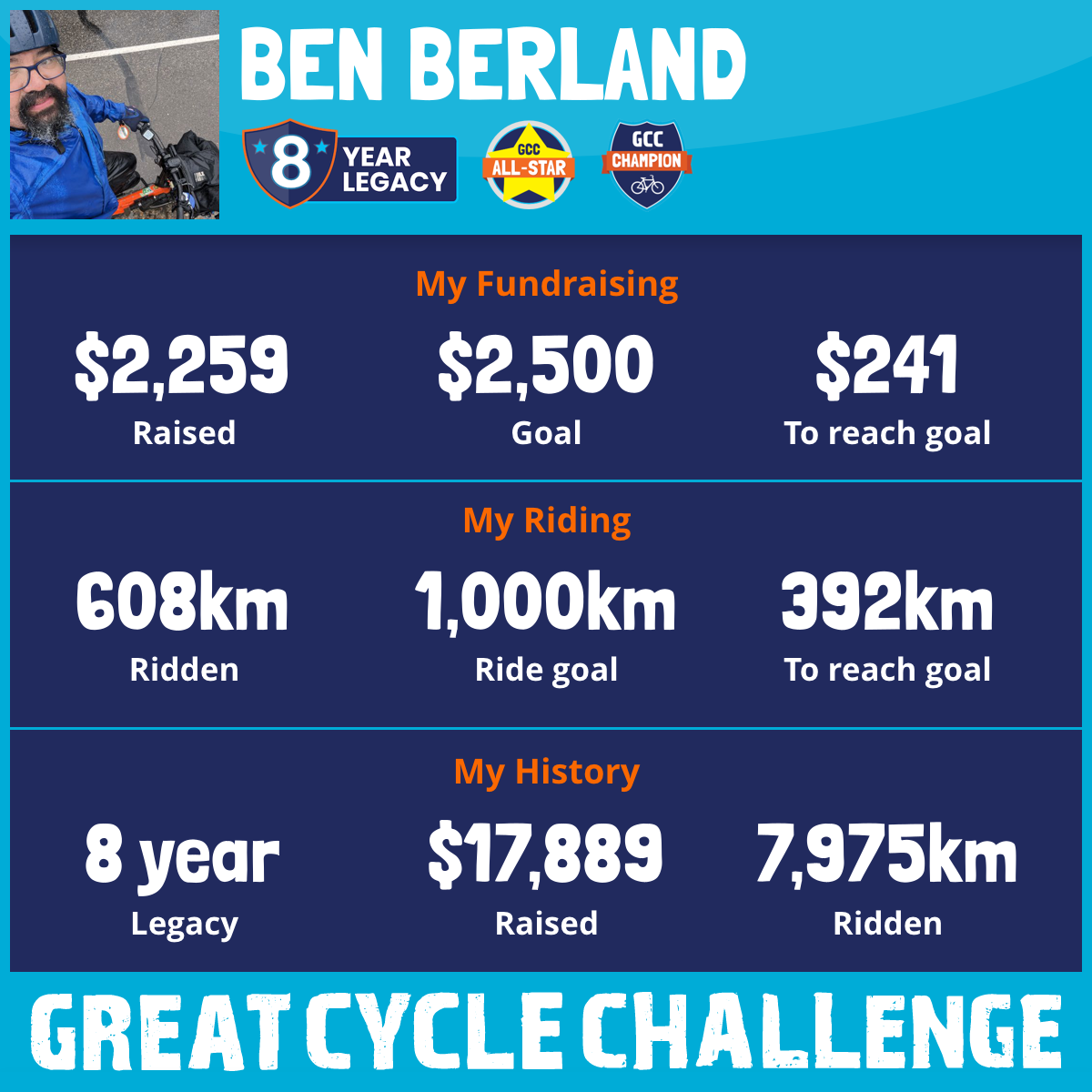 1,034 km Ridden$3,161 Raised2022
