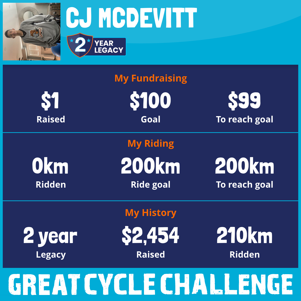 I am riding 200 km for CJ McDevitt. Please sponsor me and support my challenge to fight kids' cancer and save little lives.