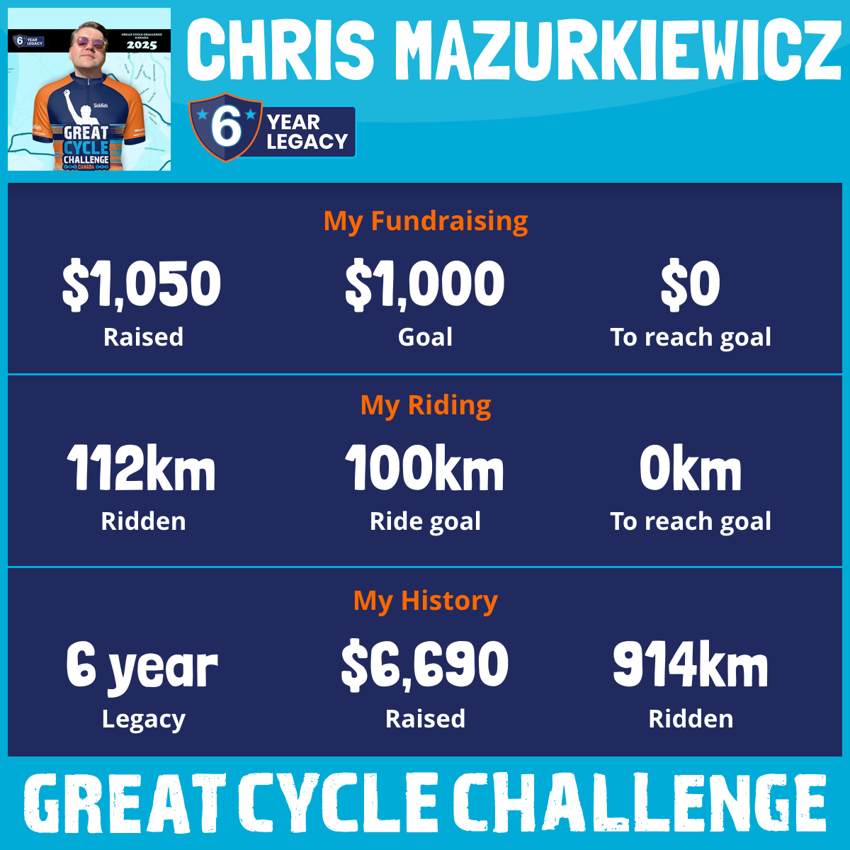 185 km Ridden$1,050 Raised2025