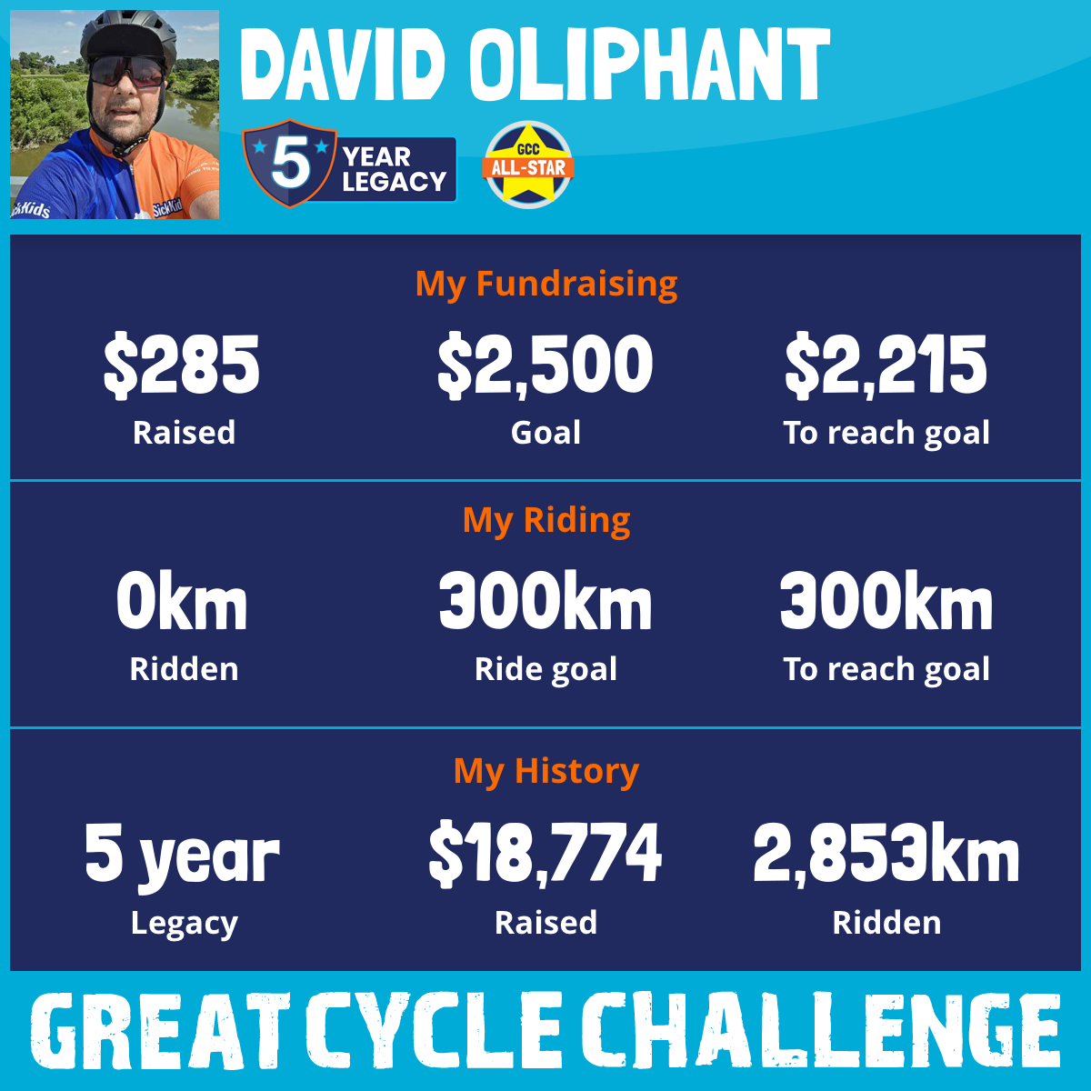 For my 5th year, this August, I am taking part in the Great Cycle Challenge to fight kids' cancer! My goal is to ride 500Kms for the month of August. With your help, together we have been able to raise almost $20,000.00 for this worthy cause since 2021.