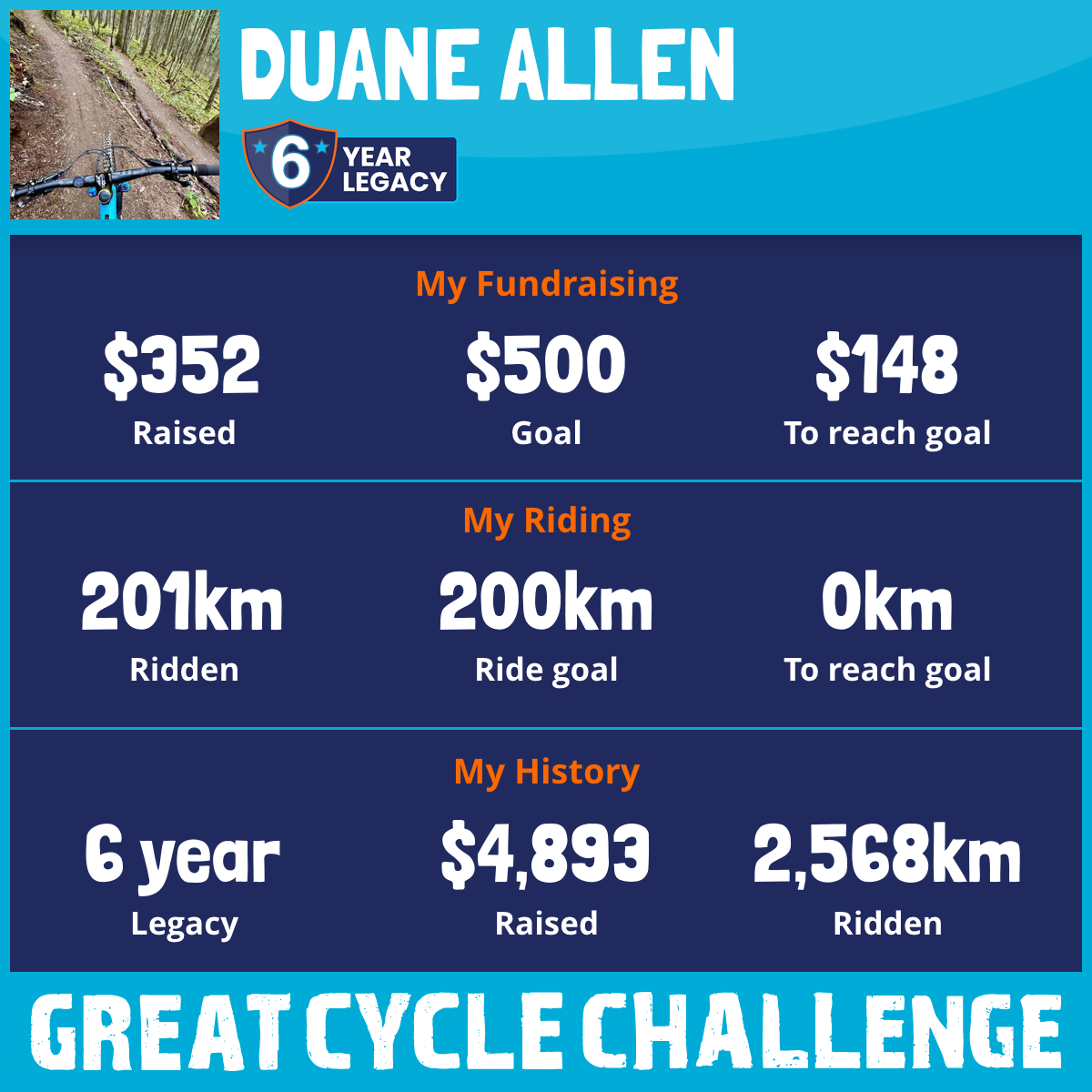 This August for my sixth straight year, I am taking part in the Great Cycle Challenge to fight kids' cancer! I plan on riding 200km of riding on a mountain bike.