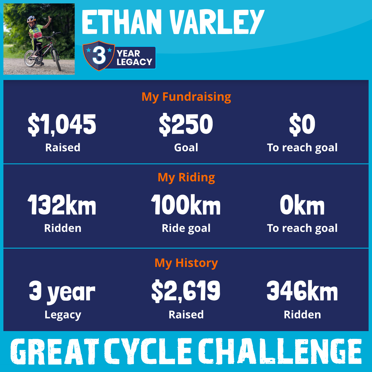 This is Ethan’s third year participating in the challenge. Last year, his goal was to ride 100km and fundraise $250. He finished the month riding 117km and fundraising $963!