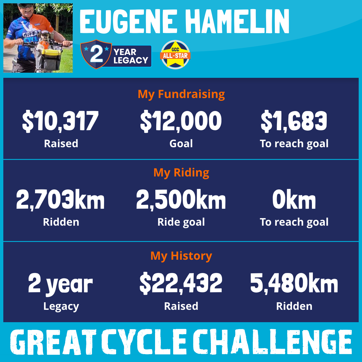 Its our third year ! Banjo and I are looking forward in taking part in the Great Cycle Challenge this August, we are just doing our part to help others ! i'm so fortunate to live in such a supporting community ,WE Wish to THANK all our supporters from local business to Family and friends .
