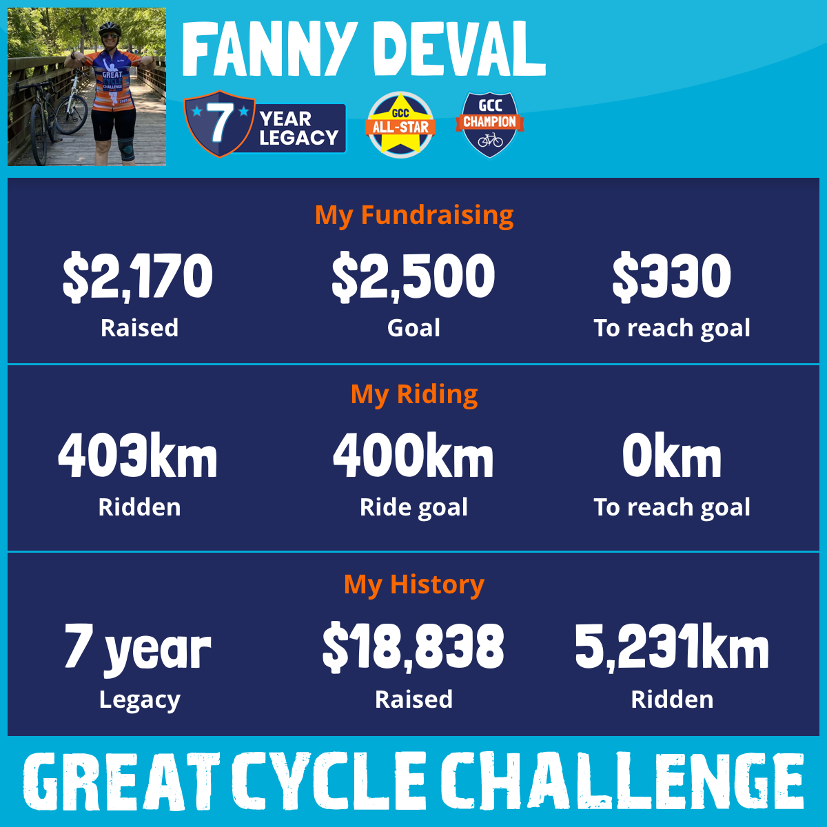 From 2017 to 2022 I rode 4,829km and raised $16,668 to give kids fighting cancer a better life!