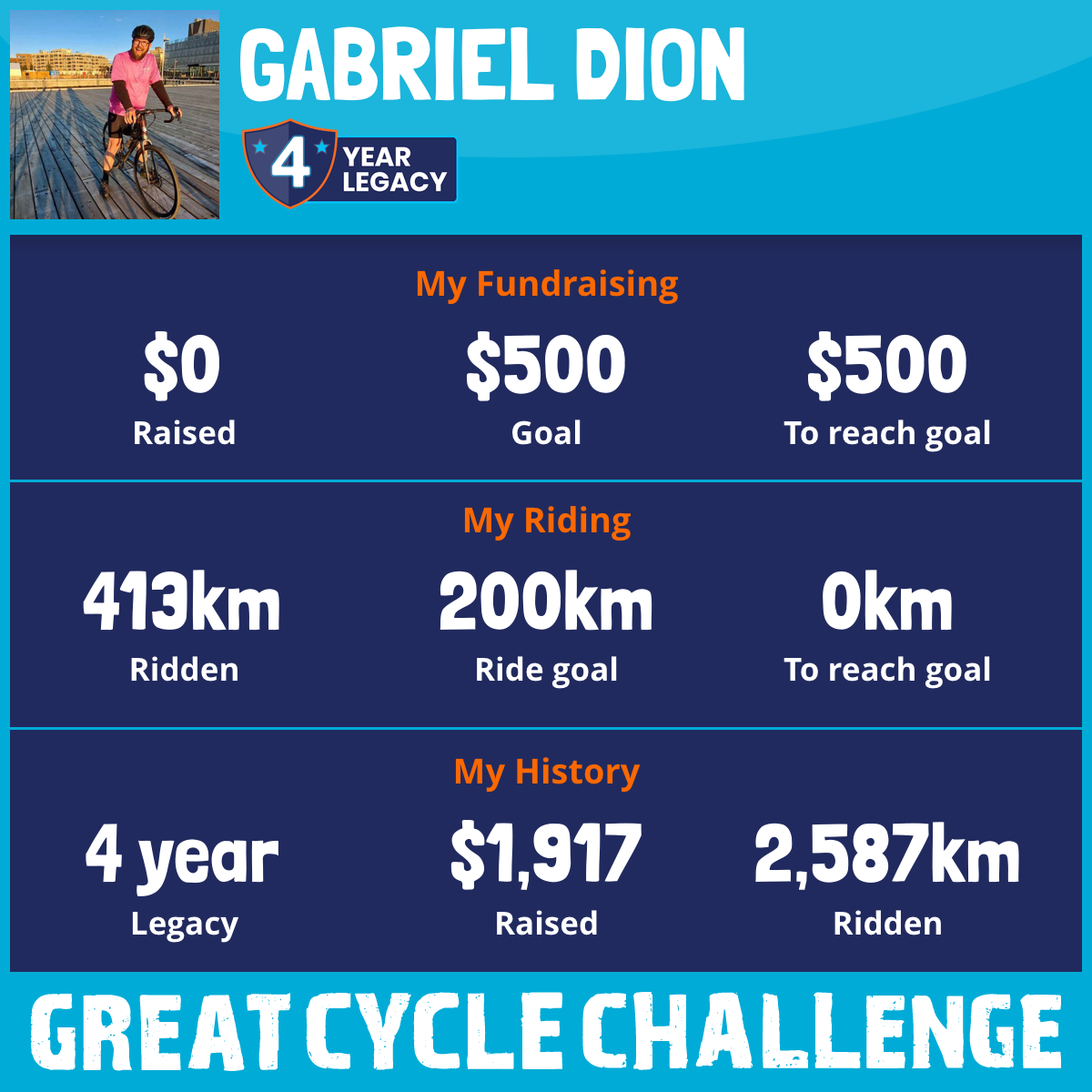 Je souhaite donner au suivant à ma manière en 2024. Je récolte des fonds pour une cause qui me tient à cœur, il s'agit de la fondation SickKids qui aide les enfants atteints du cancer. Les enfants devraient vivre et profiter de la vie, pas se battre pour survivre. Je vais donc utiliser mes grosses jambes et mon vélo pour rouler 800km durant le mois d'août et tenter de battre mon propre record personnel du même coup.