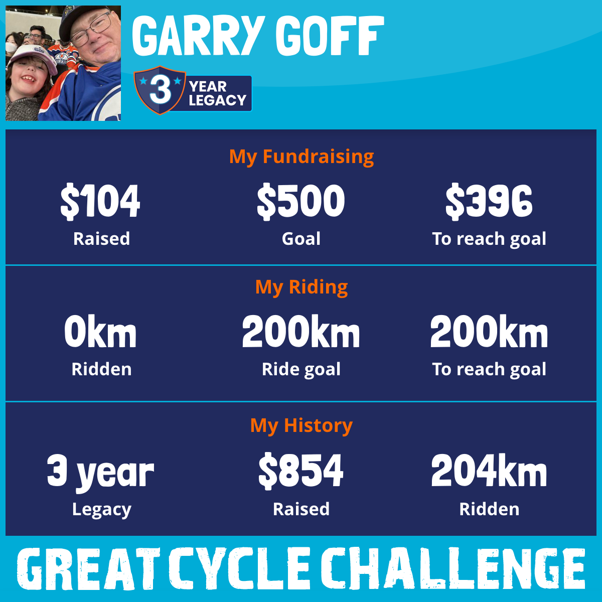 I am riding 200 km in memory of my dad, Lorne Goff. Please sponsor me and support my challenge to fight kids' cancer and save little lives.