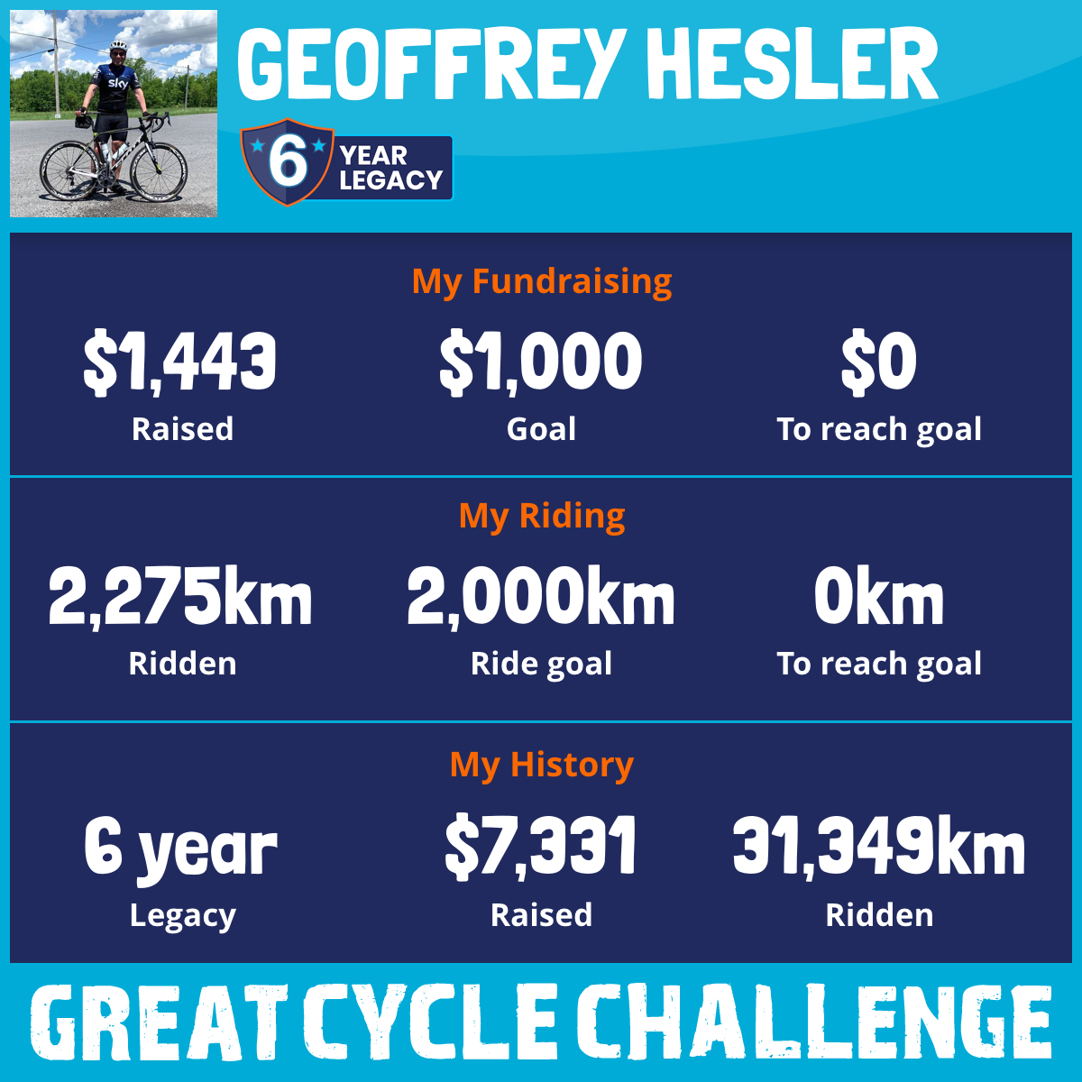 I am riding 2,000 km in memory of my friend, Gary and Monica. Please sponsor me and support my challenge to fight kids' cancer and save little lives.