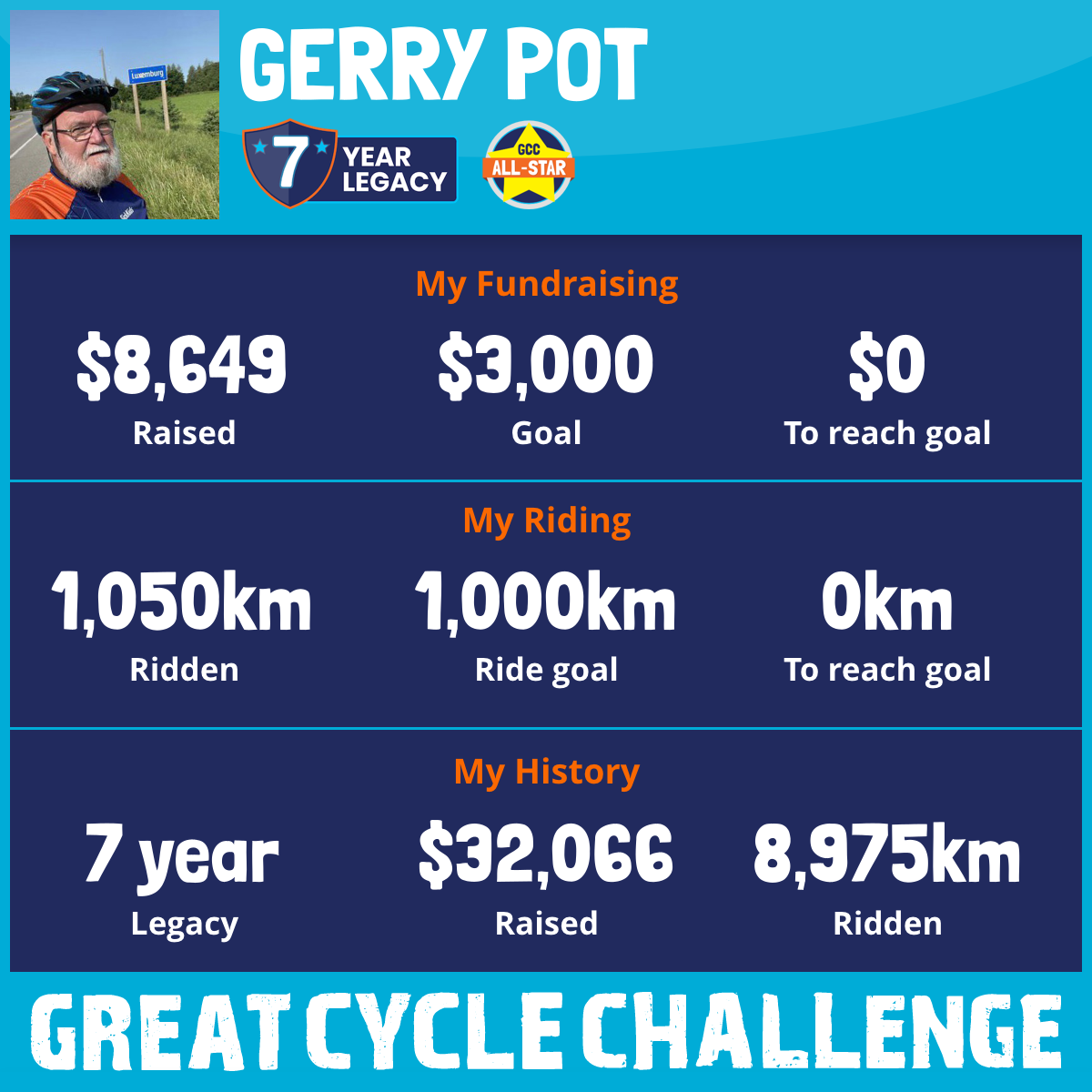 1,086 km Ridden$8,649 Raised2025