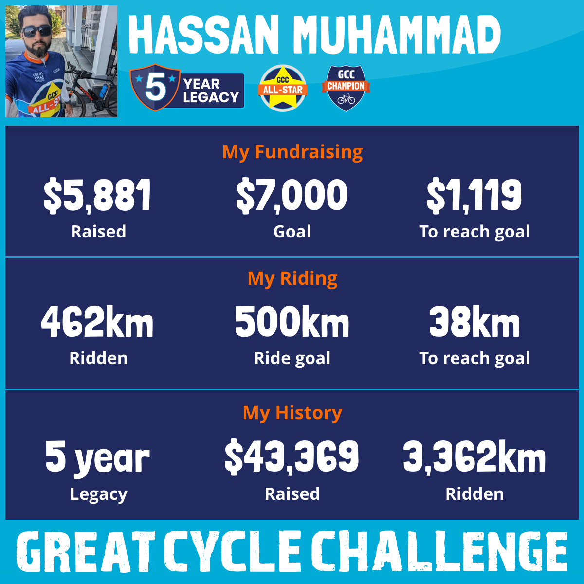 I lost a close friends 2 yr old daughter to cancer in 2020, and have started riding with the GCC since then. We need to do more to keep children from fighting against this and being able to do what they are supposed to do, PLAY! This August, I am taking part in the Great Cycle Challenge to fight kids' cancer!