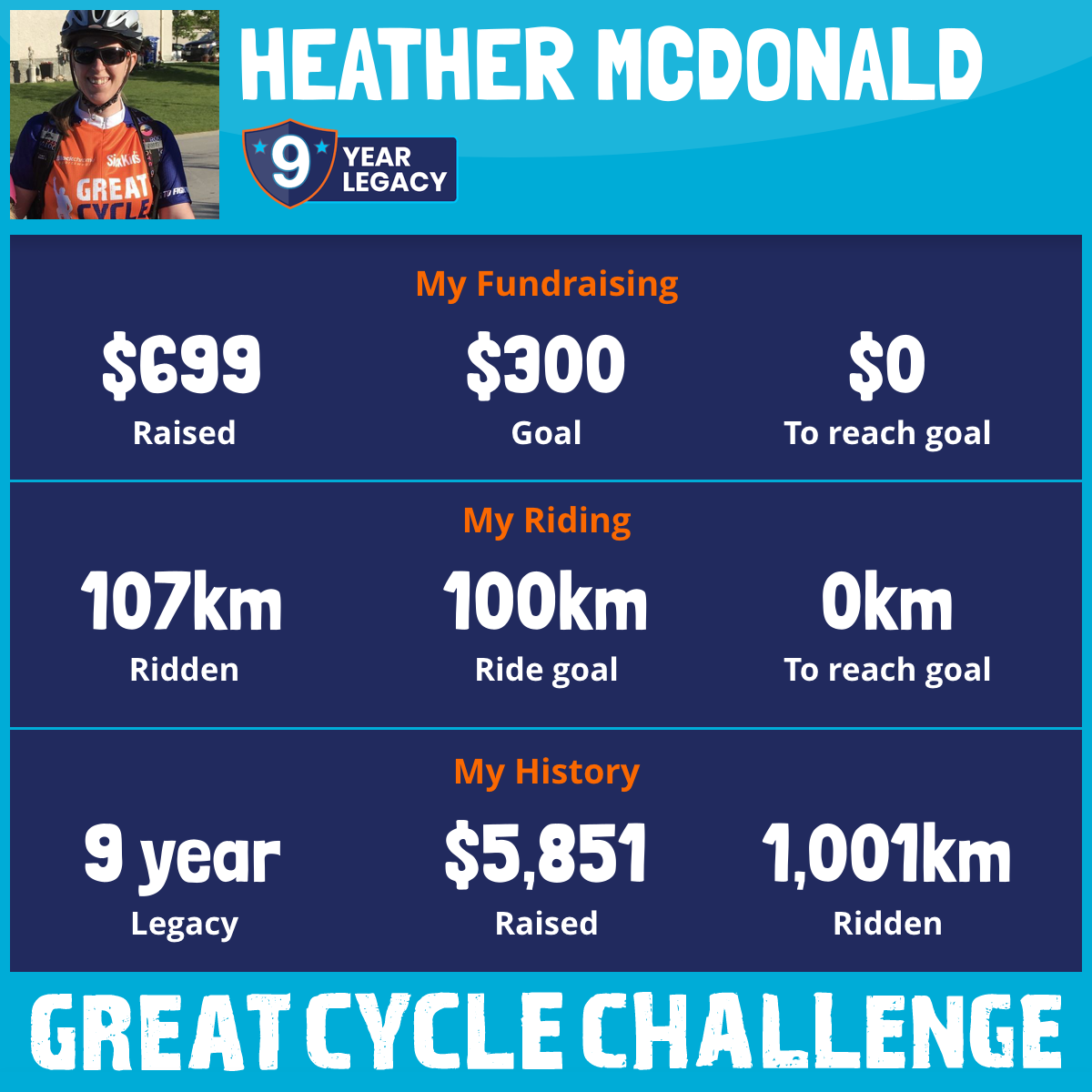 This August, I am taking part in the Great Cycle Challenge to fight kids' cancer! This will be my ninth year riding and raising funds for SickKids. Over the last 8 years I have ridden 894km and raised $5851.17 with your support! Can I count on you to help me again this year?