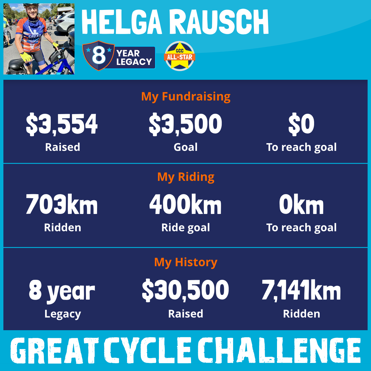 “Helga, your strength, compassion, and unwavering dedication to this cause are nothing short of inspiring. Even when facing your health hurdles, you're still pushing forward to ride for the kids — a true testament to your resilience and heart. 💛 400 km may be a “modest” goal in your words, but the impact you’re making is anything but small. You’re riding for hope, for healing, and for a future where no child has to battle cancer. Cheering you on every step (or pedal!) of the way 🚴‍♀️ With gratitude and admiration, Team Athletico!”