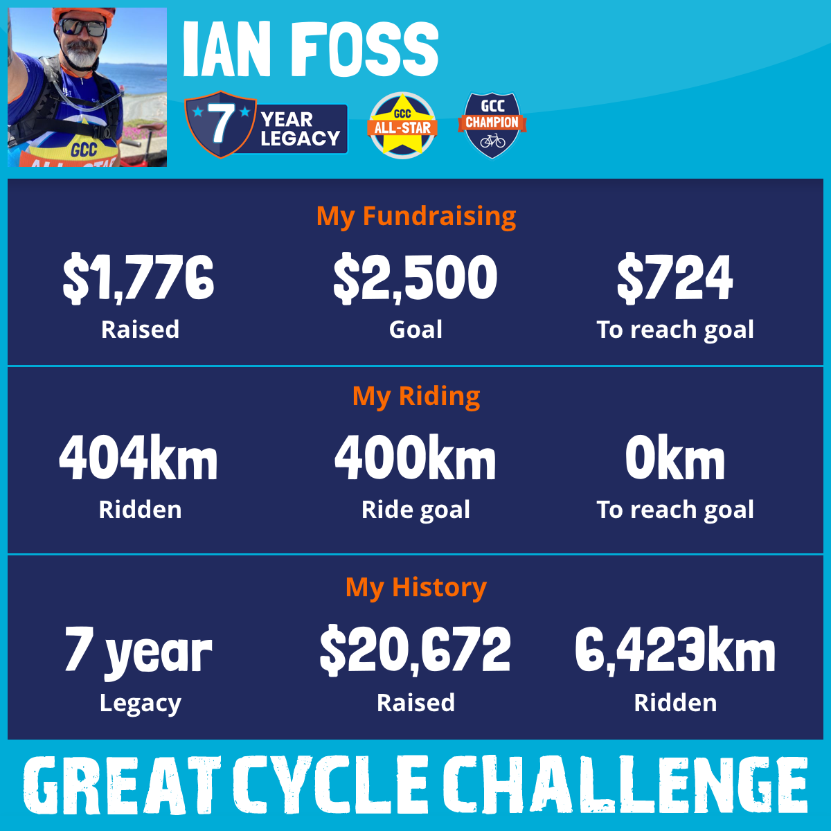 I am truly grateful to participate in the Great Cycle Challenge for the seventh year to fight kids' cancer. Over the past five years, with your support, I have raised over $19,000 while cycling over 6,000km.