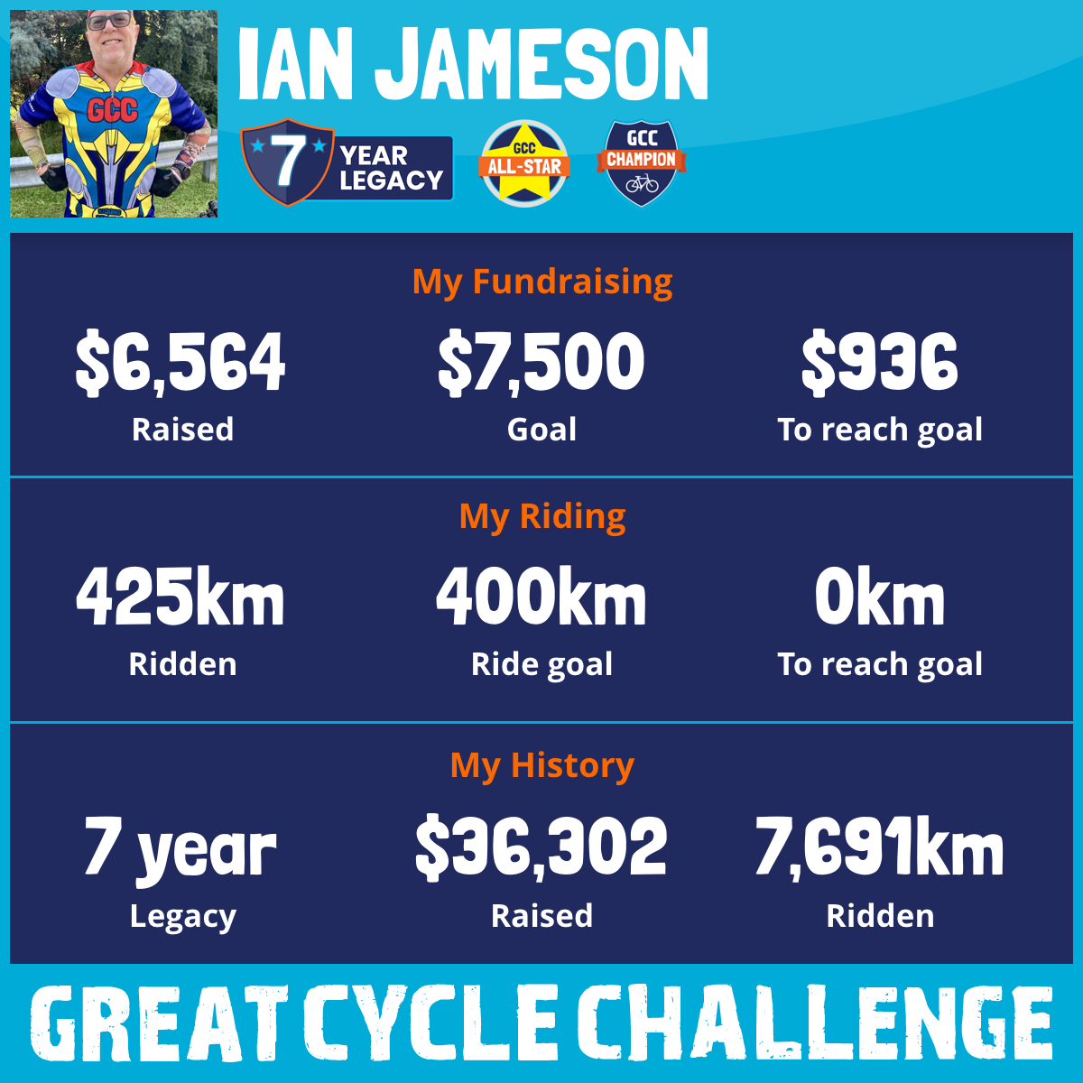 This August I am taking part for the seventh time in the Great Cycle Challenge to fight kids' cancer! In 2024 I was able to ride over 900 km for the Great Cycle Challenge and with your help I was able to raise $7,504. This year due to a fractured hip injury from a slip and fall on the black ice in my driveway in February I am hoping to be able to ride 400 km or more and raise another $7,500.