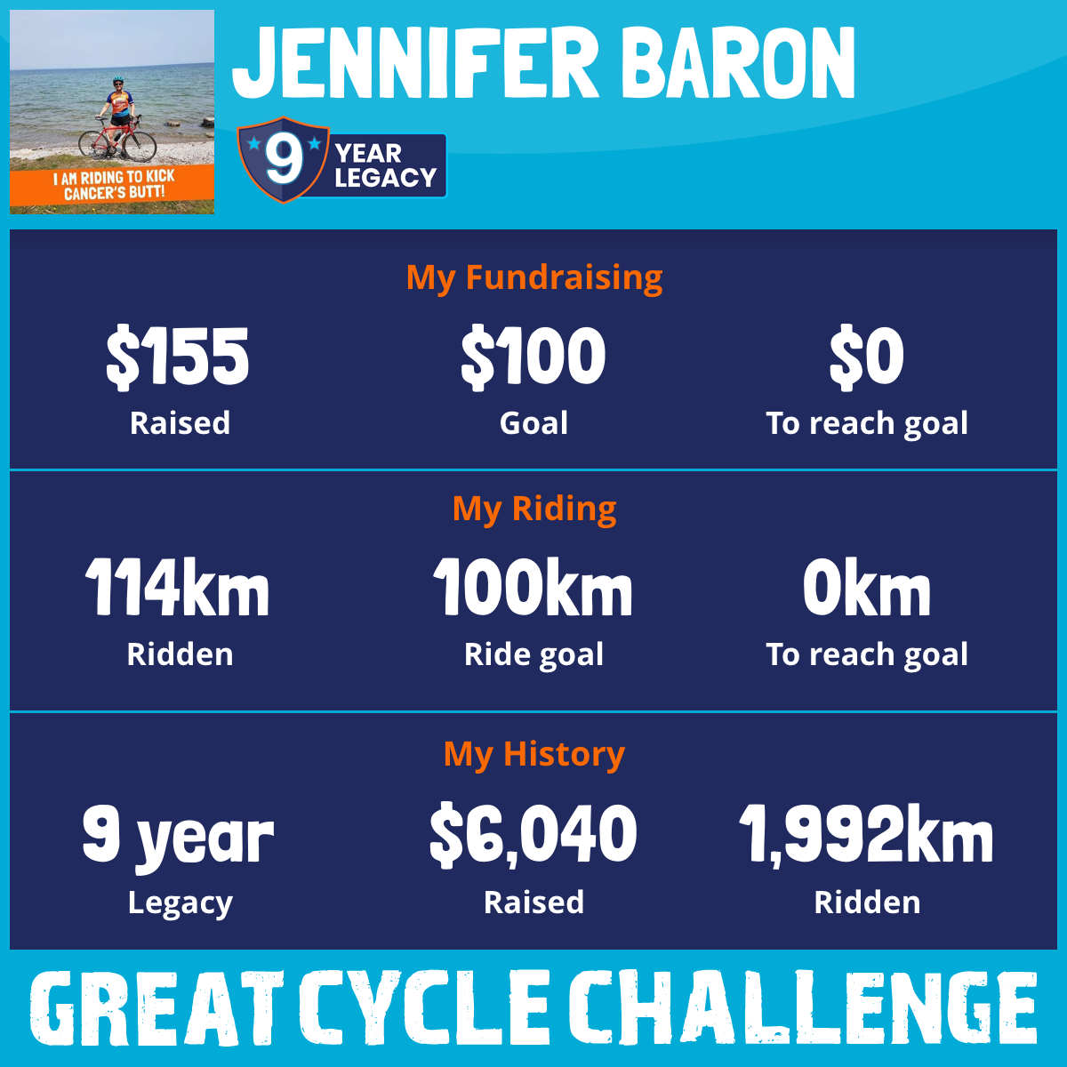 Normally I ride in memory of my mom's battle with cancer, but this year I'm going to dedicate my riding to people living with cancer. I want to send strength and honour their courage with this battle...and it is a battle. Together we can kick cancer's butt! Lots of love, Jenny.