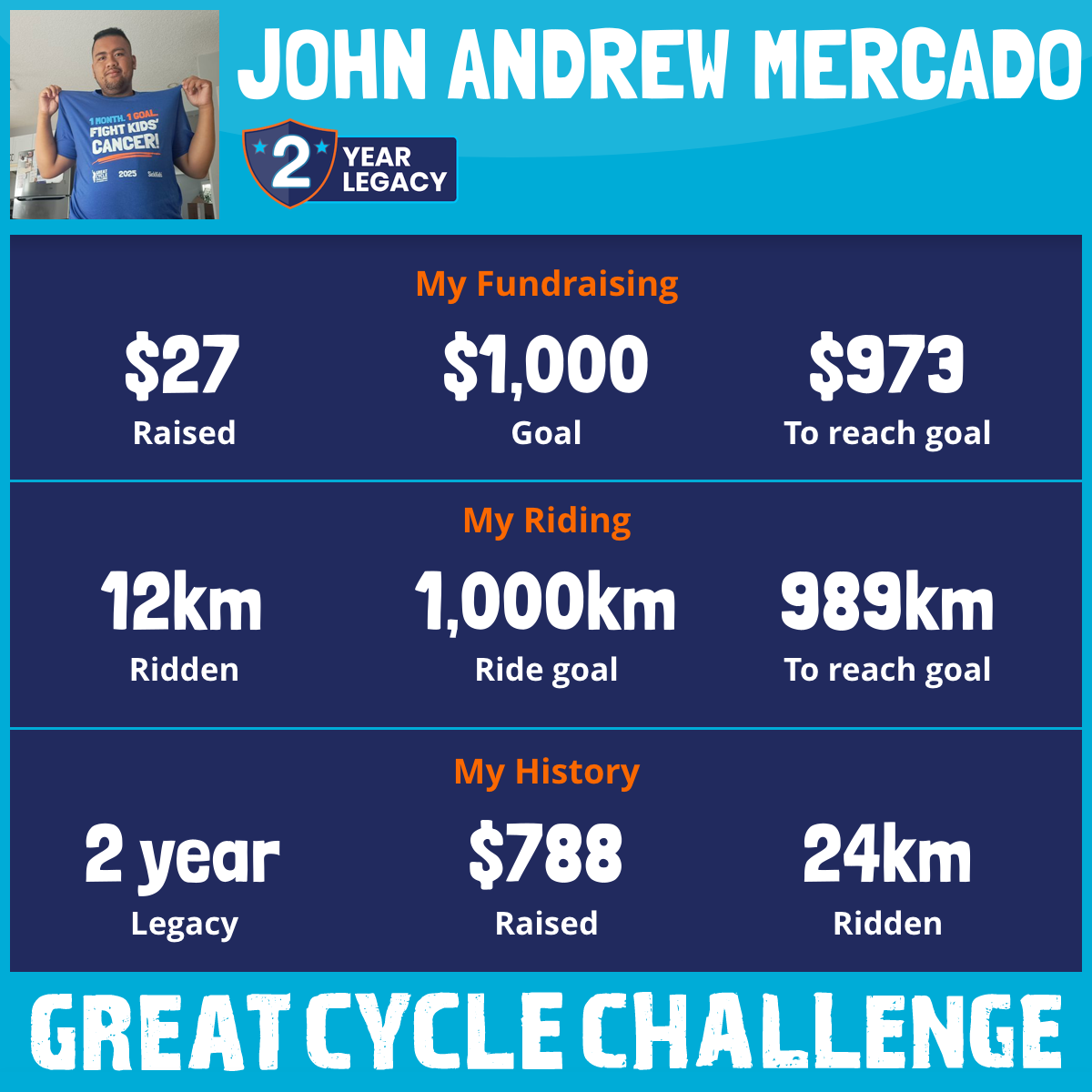 "I'm honored to be part of the Great Cycle Challenge for the second time! Last year was an incredible experience, and I'm excited to ride again for an amazing cause."