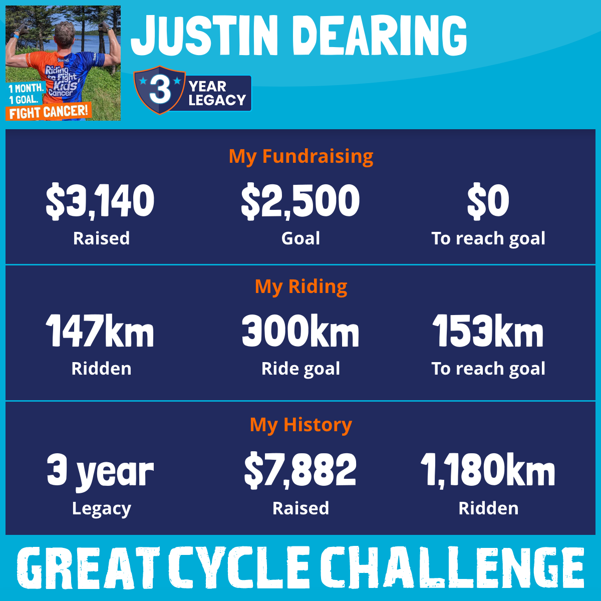 I'm riding for all the children fighting for their little lives and keeping their hopes up! My inspiration is my Dad and mother-in-law Susie who are cancer survivors (as were both my late Nanny and Poppy Dearing). My Uncle Dick, father-in-law Colin, and his sister Judy who live with it every day. And in memory of my Aunt Valerie, Aunt Vera, Aunt Peggy, Uncle Keith and our Uncle Philip and Uncle Doug who each lost their battle with the disease but live on in all our hearts.