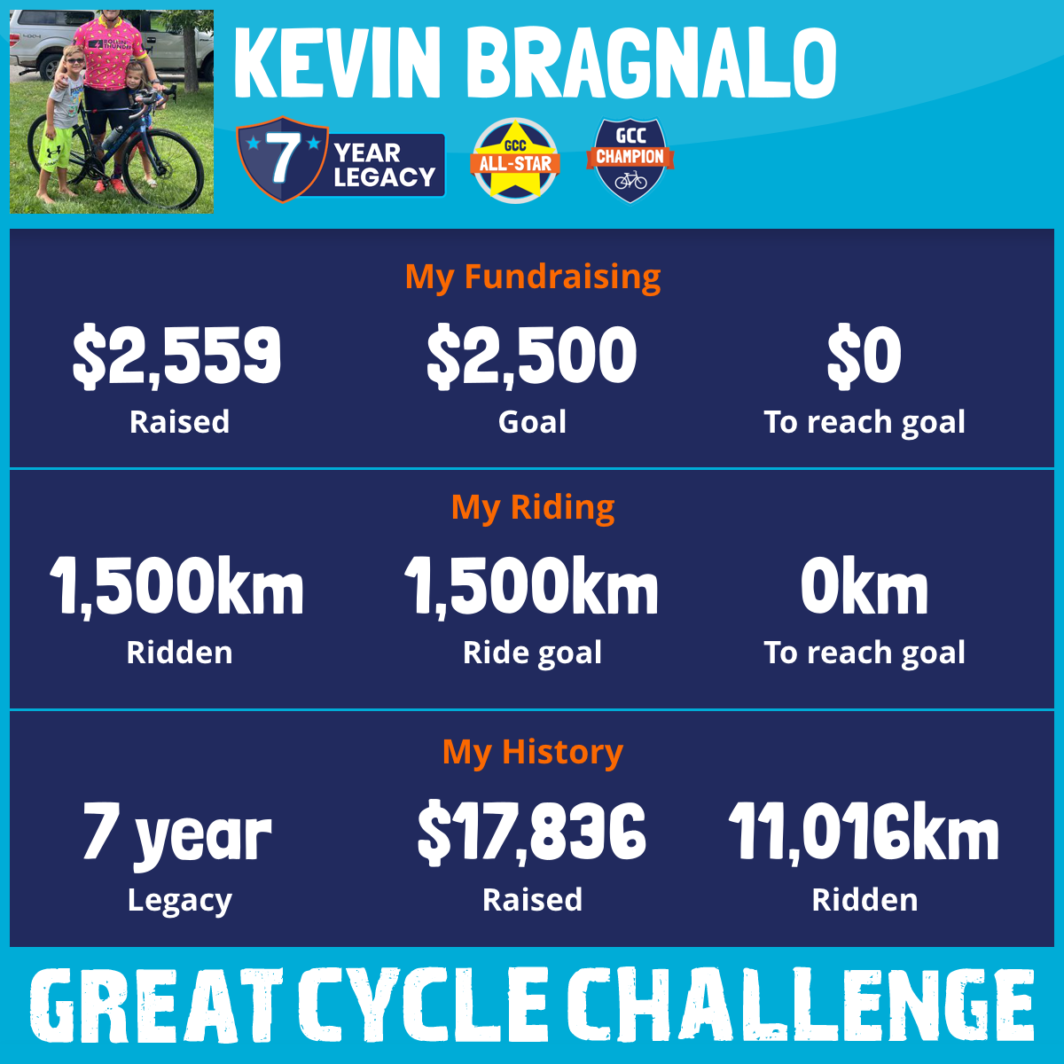 Last year I rode 1,500km with all the support of family and friends. What kept pushing me is what I was riding for. This year I’ll be riding 1,500km with adding 500 push-ups. I’ll also have my 6 year old son ridding his bike this year so he will join me on some of my runs! My mom passed away from cancer 2 weeks after my wedding. My dad passed away when I was a 1 year old. Even tho I’m riding for kids with cancer just the disease itself sits in my mind. Having two kids myself I couldn’t imagine going through the pain that families have to go through with cancer treatments.