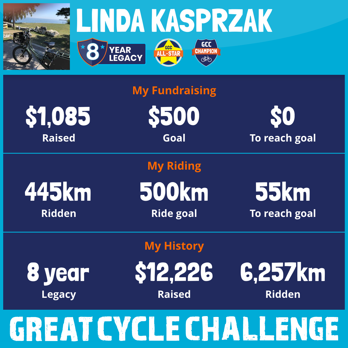 This August I ride again in the Great Cycle Challenge for the 8th year hoping that my contribution added to others will make a BIG difference.