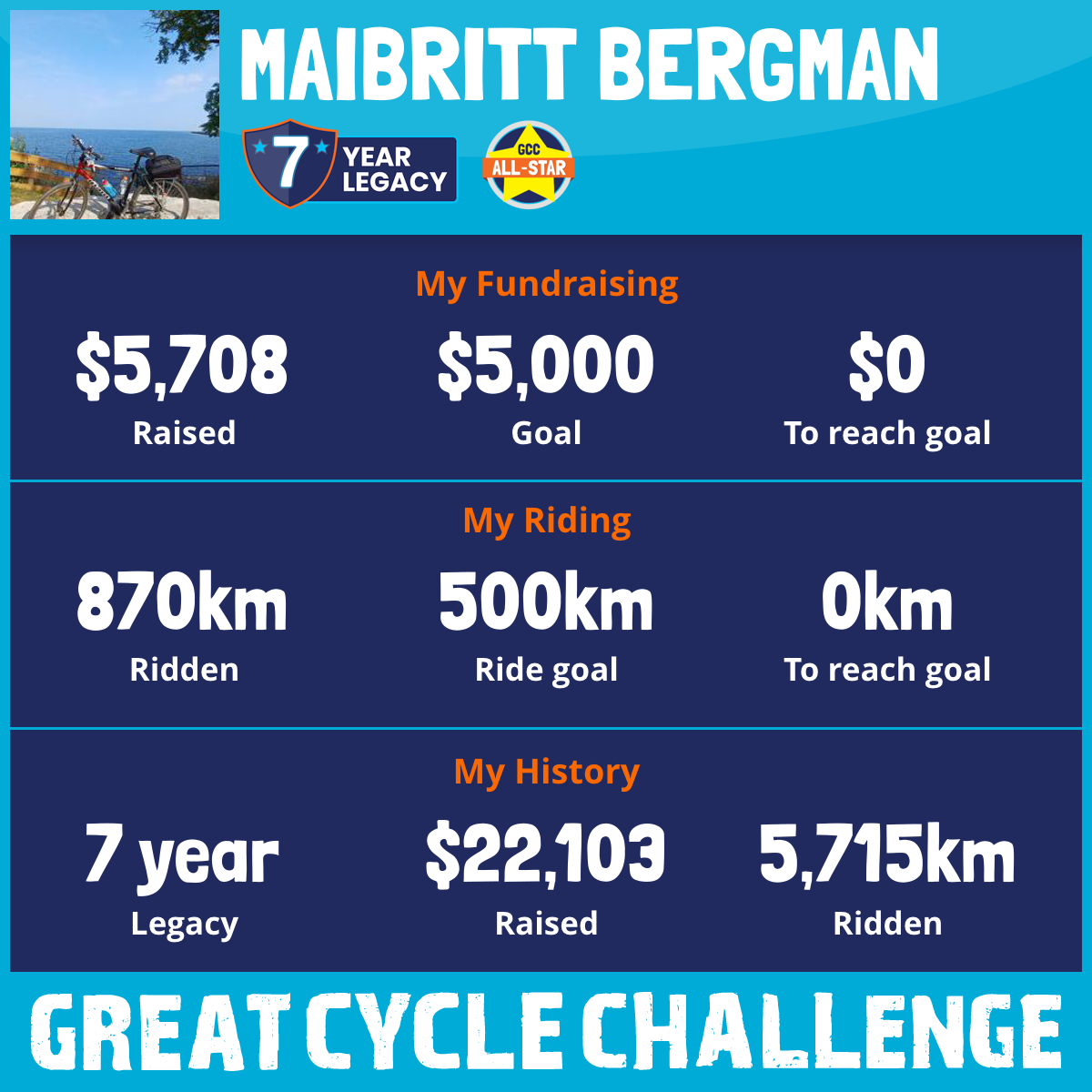 This is my 7th year to ride and raise funds for the Great Cycle Challenge. Every year this challenge touches my heart as family & friends of all ages are diagnosed with cancer. I am thankful to have continued health and strength to ride and support the SickKids Foundation for more children's cancer research.