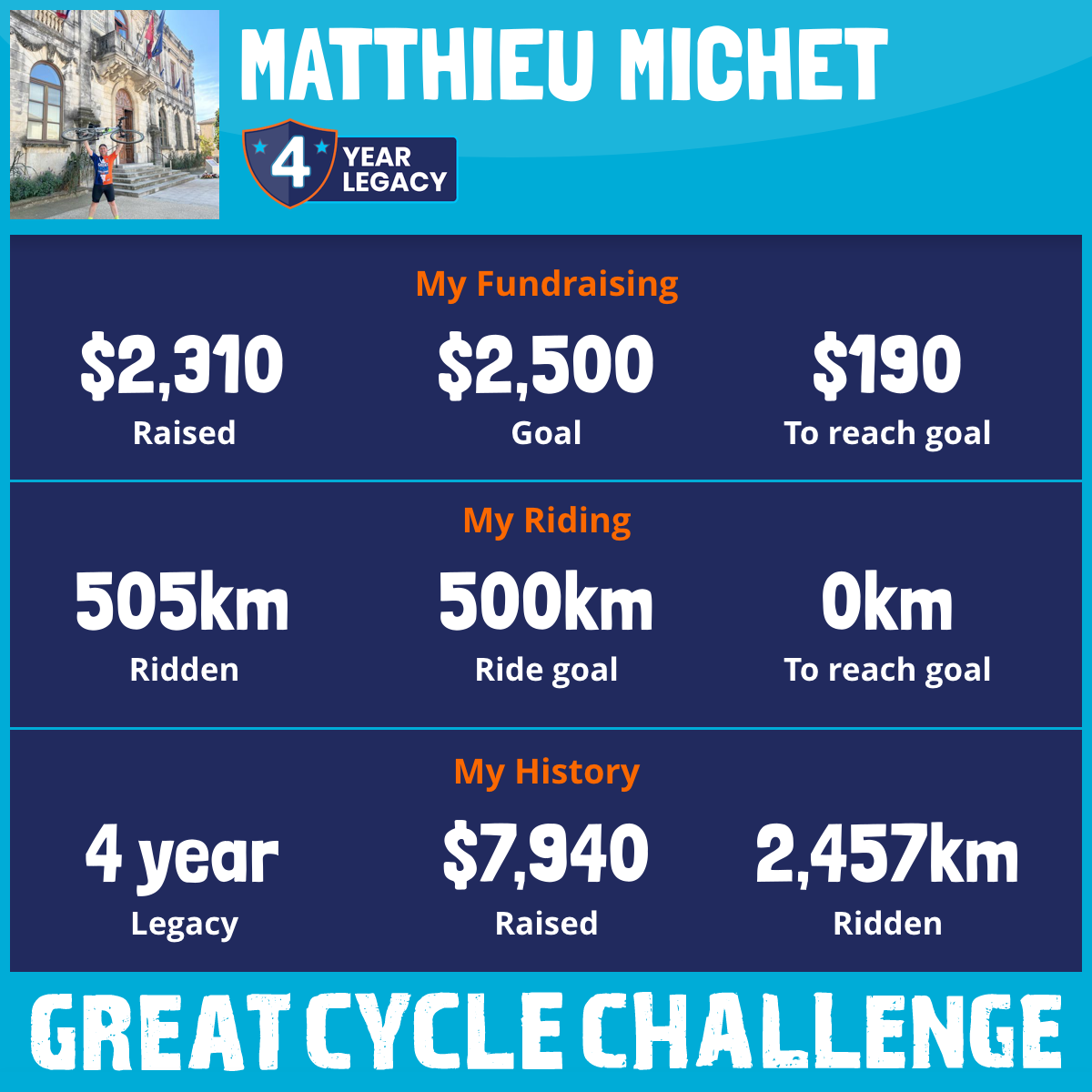 I ride in memory of two very special people in my life: my father, Claude Michet, and my grandmother, Simone Joanny. Both of them were taken by cancer. They were not children, but they were people who deeply loved children, cared about others, and believed in kindness, generosity, and protecting what truly matters. They played an important role in shaping who I am today, and their values continue to guide me. I know that if they were still here, they would be incredibly proud to see this challenge and would be among the first to support it. Riding for kids’ cancer is my way of honoring their memory, carrying their love forward, and turning loss into something meaningful.