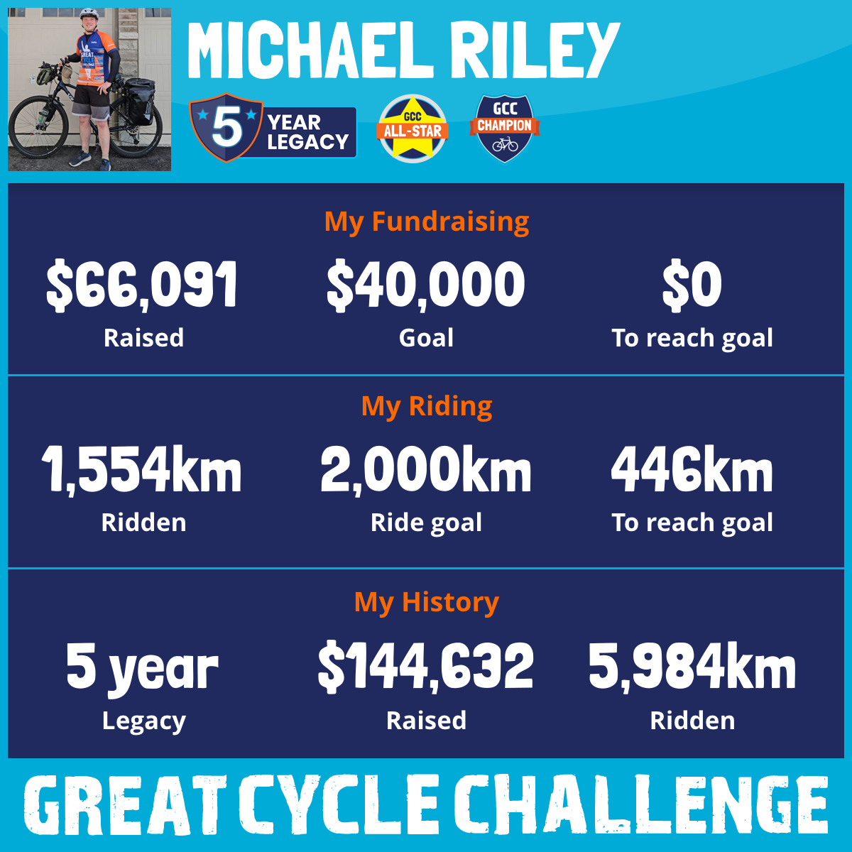 My name is Michael Riley, and I am honored to be participating in The Great Cycle Challenge for the fifth year, now as a Champion Rider!