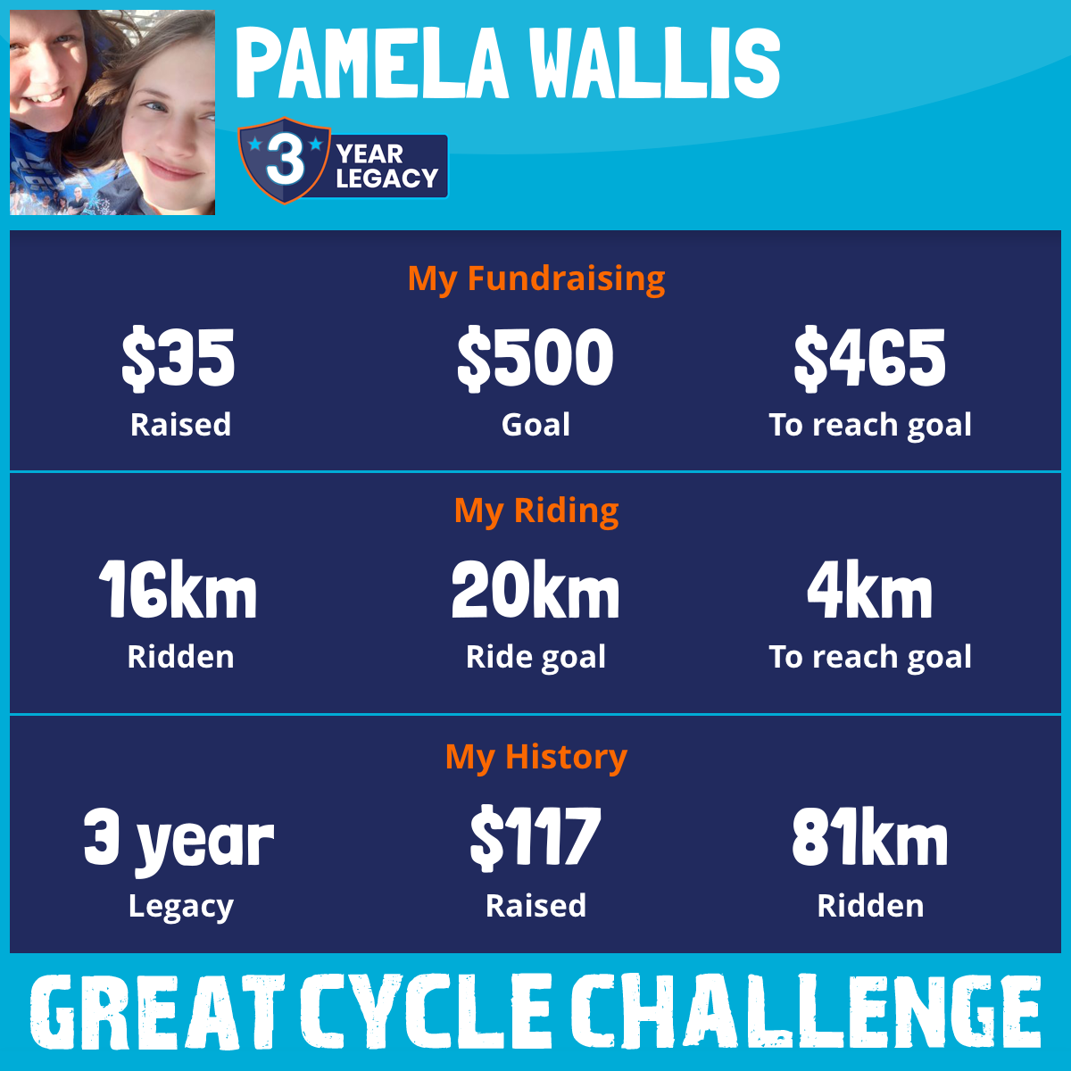 I am riding 20 km in memory of my dad, Peter wallis. Please sponsor me and support my challenge to fight kids' cancer and save little lives.