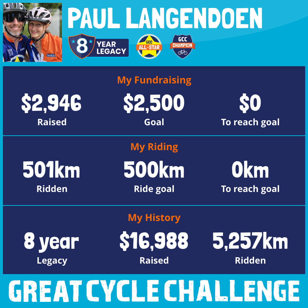 Most of us have been touched by cancer in our lives. Be it family or friends, young or old, cancer doesn't discriminate. I am doing the Great Cycle Challenge for the 6th time to help in the fight against this disease.