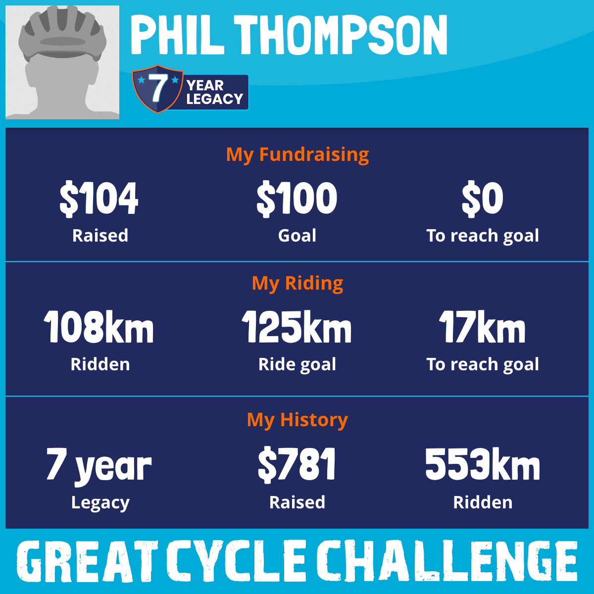 I am riding 125 km for Mike & Dawn Thompson and Phyl Staples. Please sponsor me and support my challenge to fight kids' cancer and save little lives.