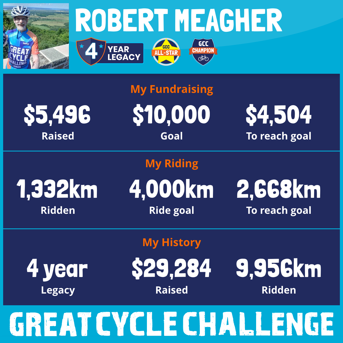 I am SO PLEASED to be back and participating in the 2026 edition of the Great Cycle Challenge (GCC)! This will be my 5th year participating in this remarkable event! I am raising funds through my GCC to support the SickKids Foundation efforts to develop treatments and, ultimately, find a cure for childhood cancer.