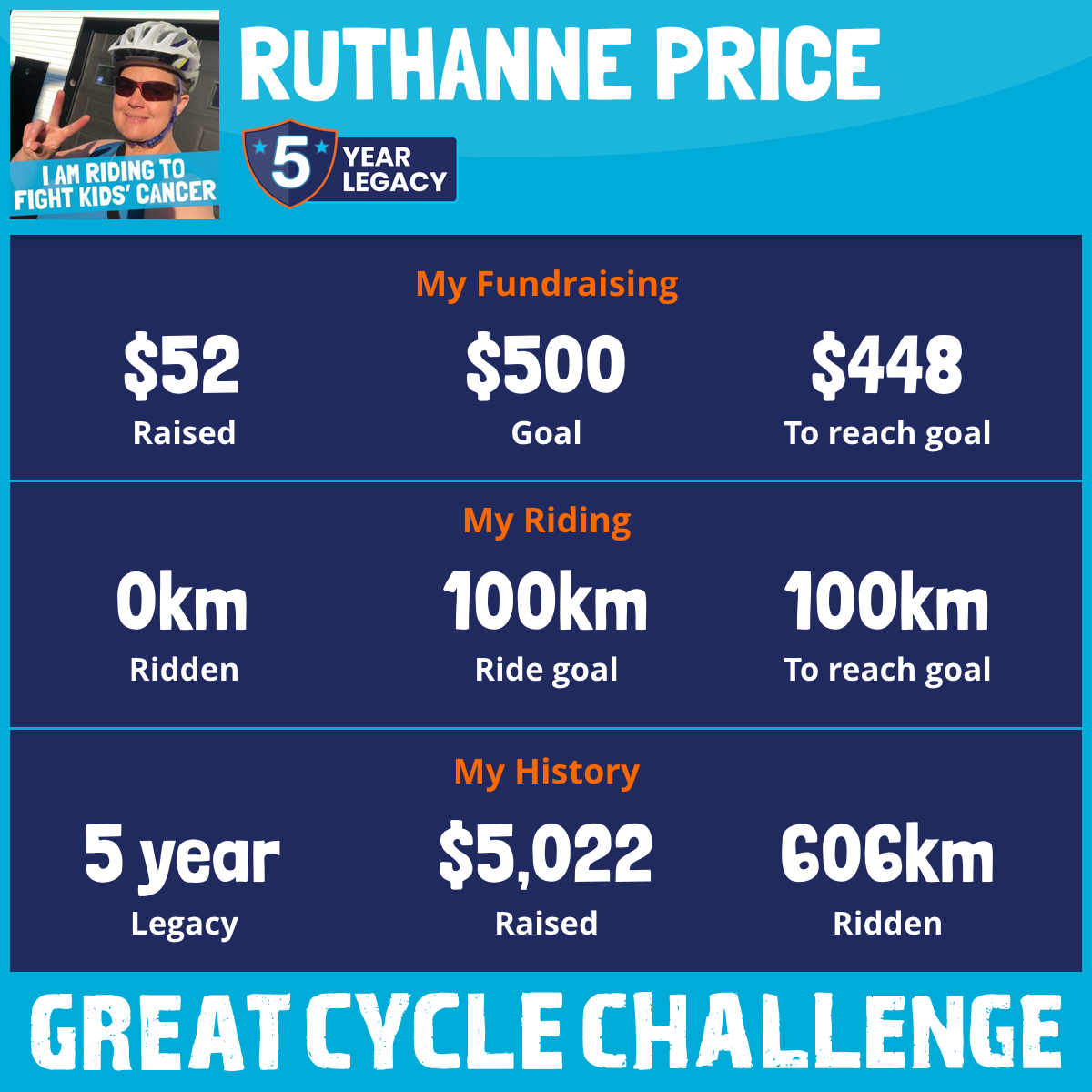 This is my third year doing the Great Cycle Challenge. I have upped my distance goal to 300km for this year's challenge. And I have upped my fundraising goal to $2500. You can help me reach both! If you donate and help me meet my fundraising goal, I will feel obligated to hit my distance goal! And if you push me past $2500? Maybe I will have to push past 300km!!