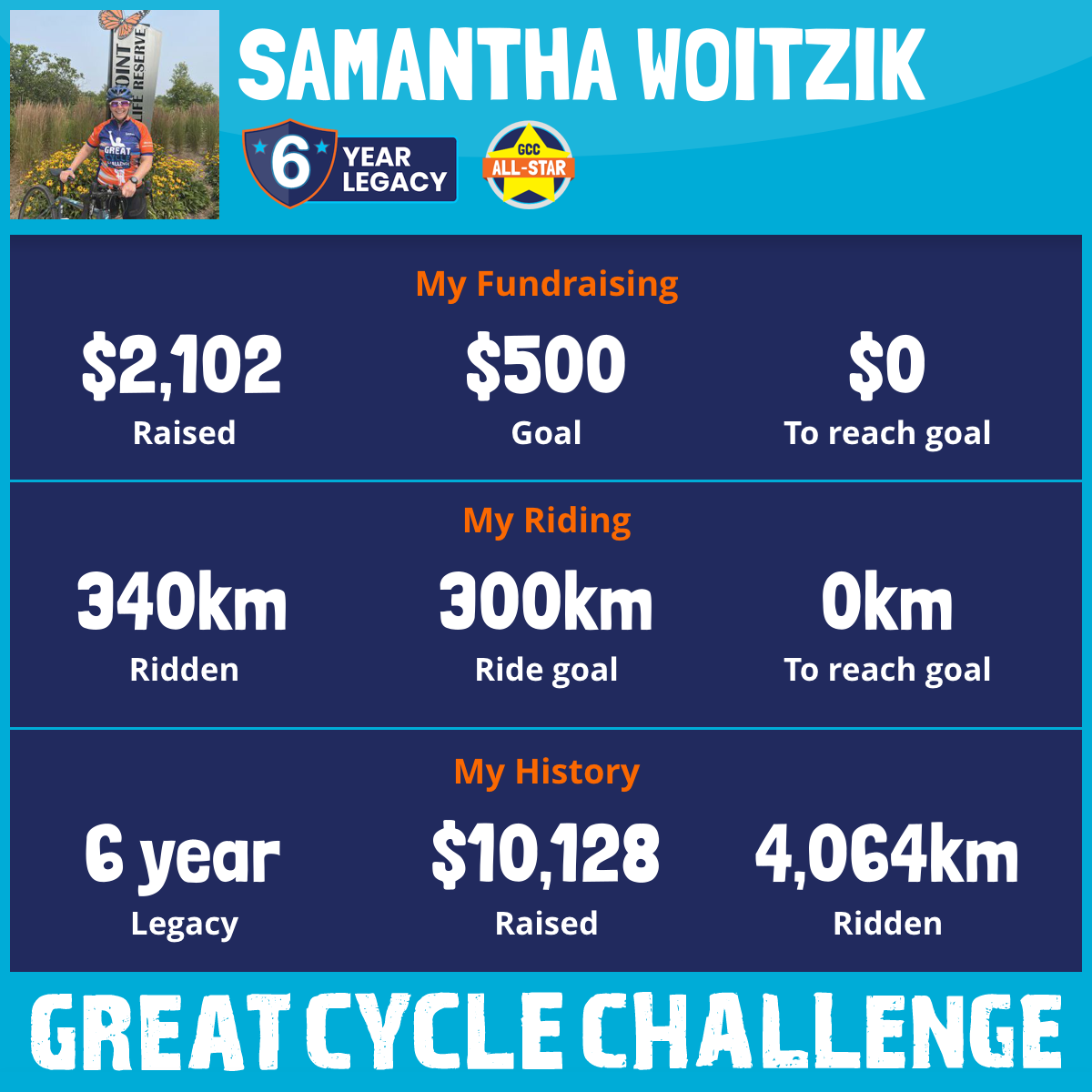 I am riding 300 km in memory of Ben Algar, Sandra Johnson, Bev Woitzik, Barbara Verstraeten. Please sponsor me and support my challenge to fight kids' cancer.