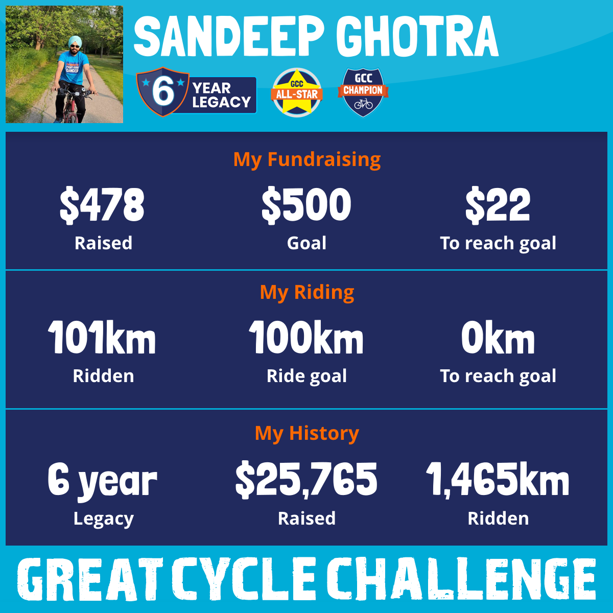 This is my 6th year participating in Great Cycle Challenge Canada and supporting SickKids Foundation for all the kids and families impacted by childhood cancers. This August, I am taking part in the Great Cycle Challenge to fight kids' cancer!