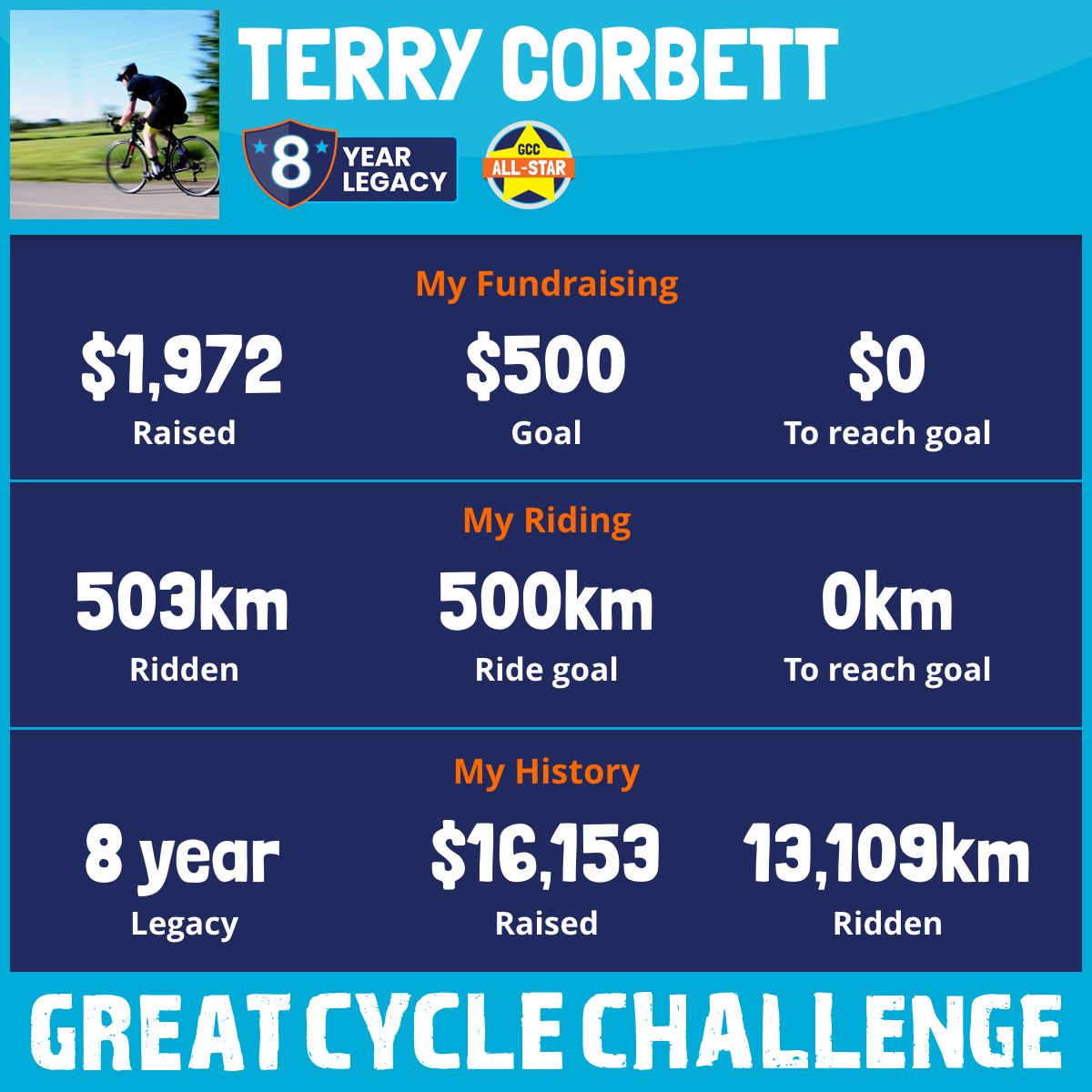1,503 km Ridden$1,389 Raised2021