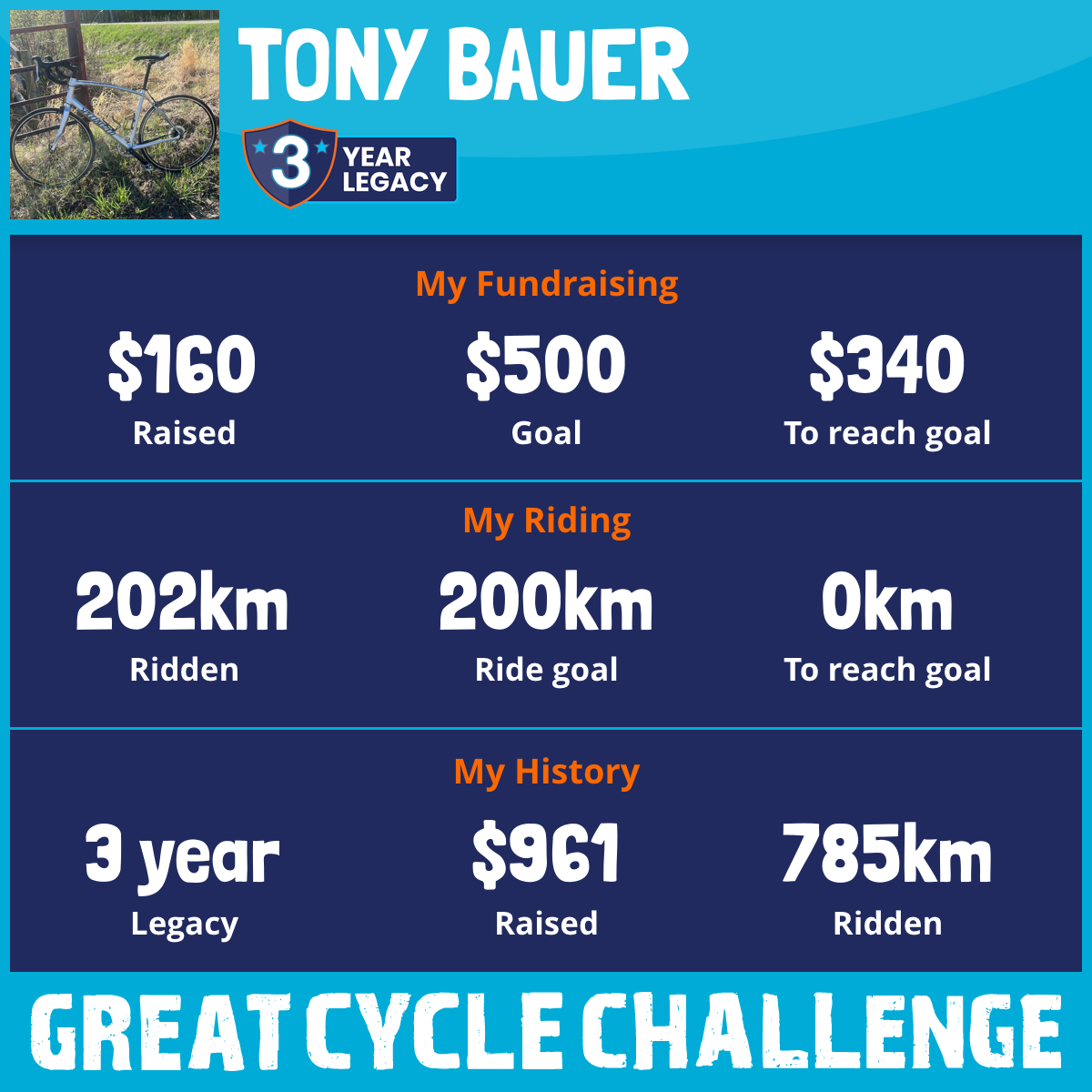 I am riding 200 km in memory of Little E Bauer. Please sponsor me and support my challenge to fight kids' cancer and save little lives.