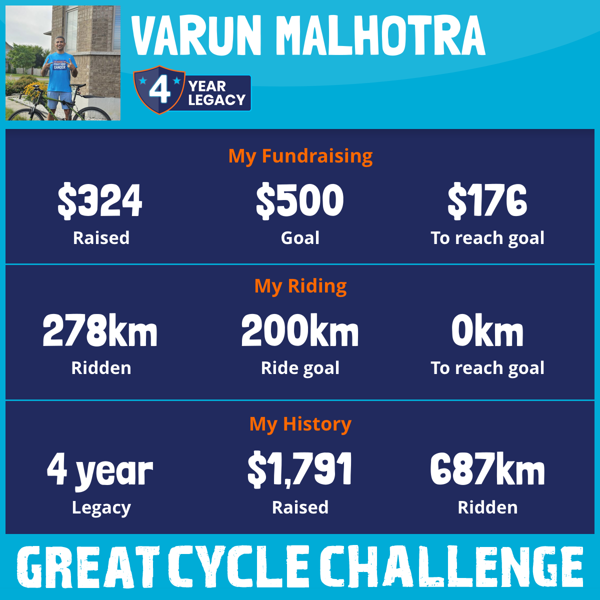 I'm back for Year 4 of the Great Cycle Challenge! Thanks to the amazing support from friends, family, and generous strangers, we've raised crucial funds for this cause.