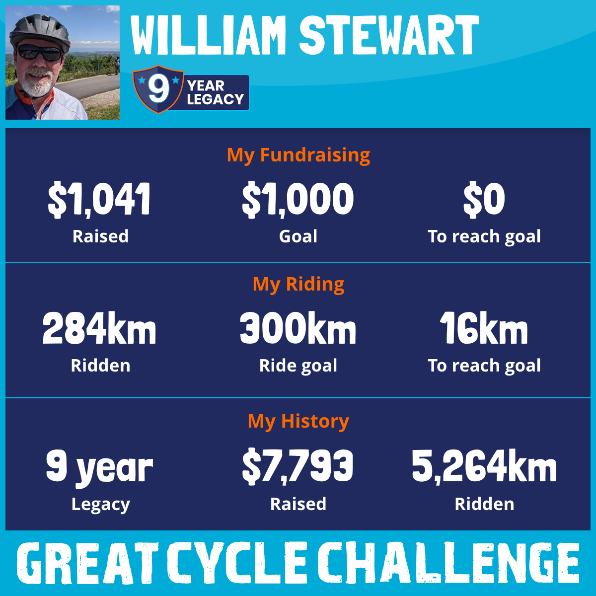 Generally I would aim to ride 800 km in the monthof August. This year, due to some health issues I've had and a week-long trip in the midst of August, my riding goal is 300 km. With your help, I hope to raise $1,000 in donations for cancer treatment and research.