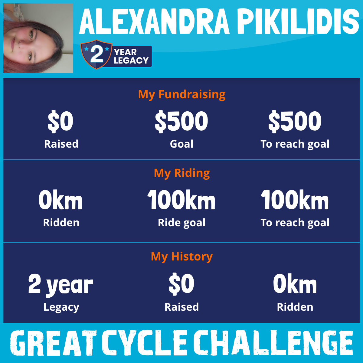 I am riding 100 km in memory of my aunty, chrysanthi. Please sponsor me and support my challenge to fight kids' cancer and save little lives.