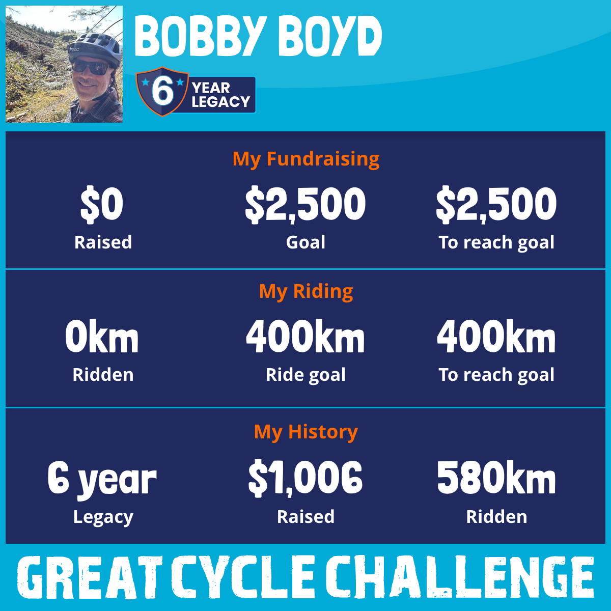 I am riding 400 km for Margeret and Robert Boyd. Please sponsor me and support my challenge to fight kids' cancer and save little lives.