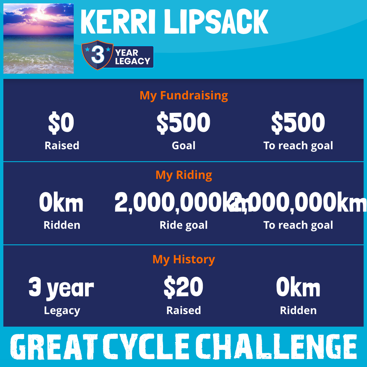 I am riding 2,000,000 km in memory of my mum, norma lipsack. Please sponsor me and support my challenge to fight kids' cancer and save little lives.