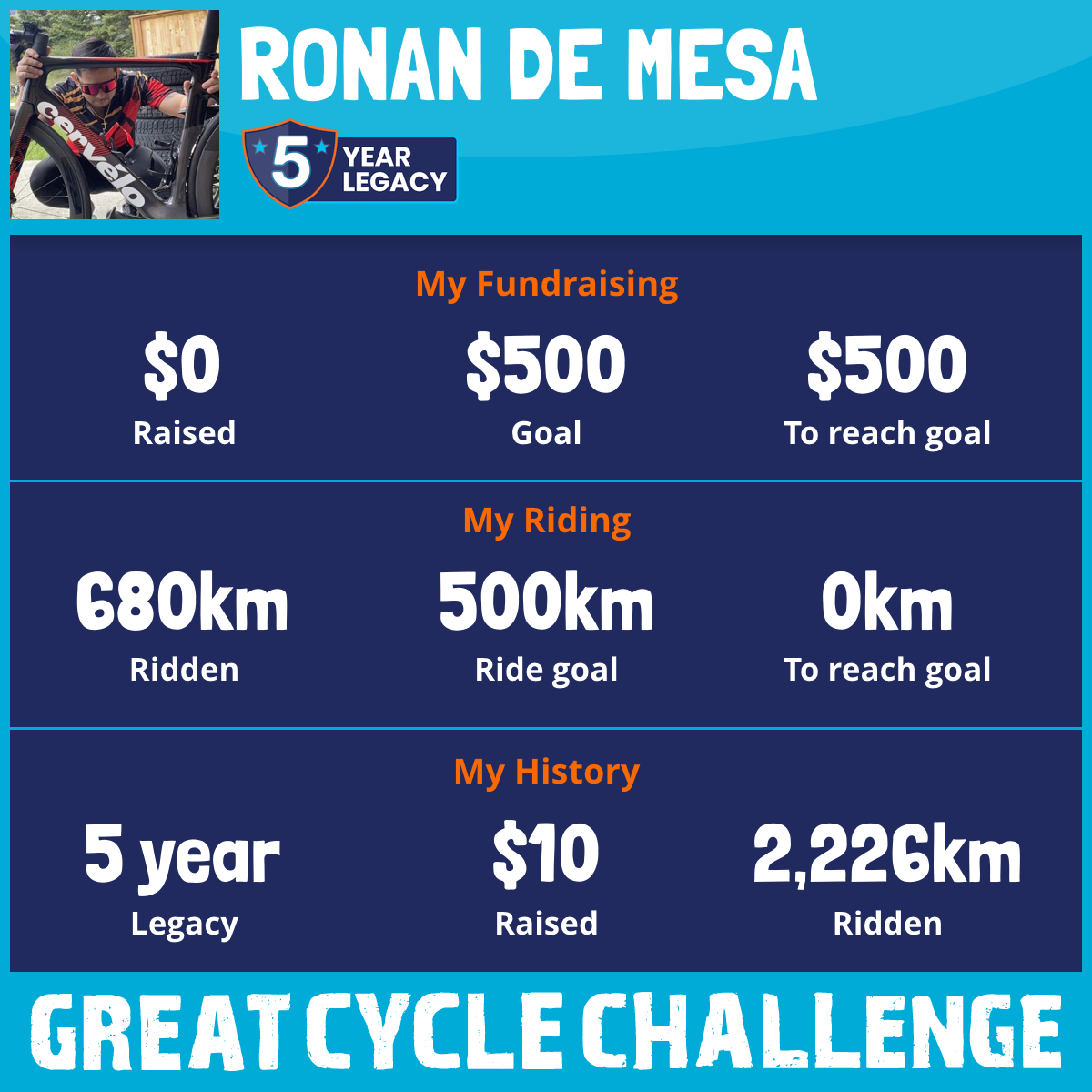 I am riding 500 km in memory of Precy de mesa. Please sponsor me and support my challenge to fight kids' cancer and save little lives.